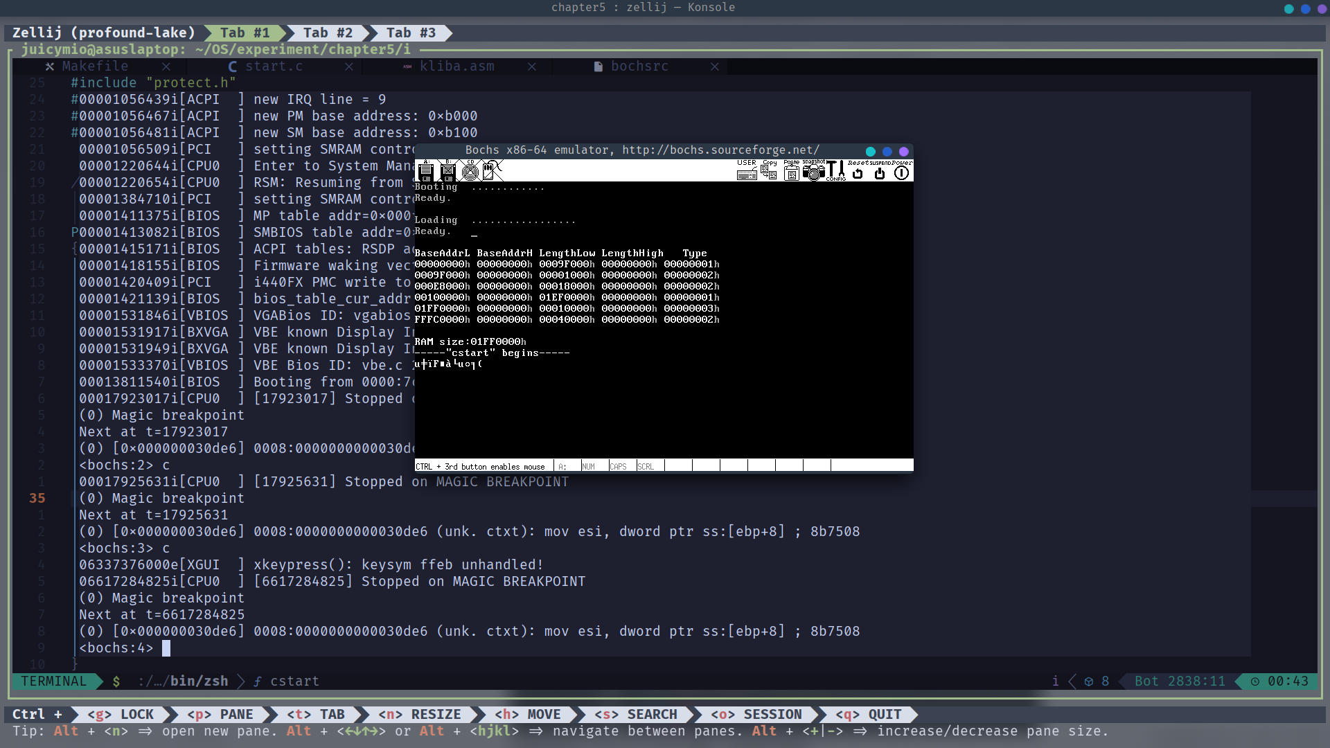 在进行orange chapter5的第i个实验时,第二个disp_str的输出会变成乱码。原本笔者以为是对输出字符串的修改导致了错误,但经过许多尝试发现即使不做任何修改,只要编译一下原始的代码,第二次disp_str的输出就是乱码。更诡异的是原本附件中的a.img的运行结果是正常的,那么这有可能是编译环境不同,导致出现了问题。