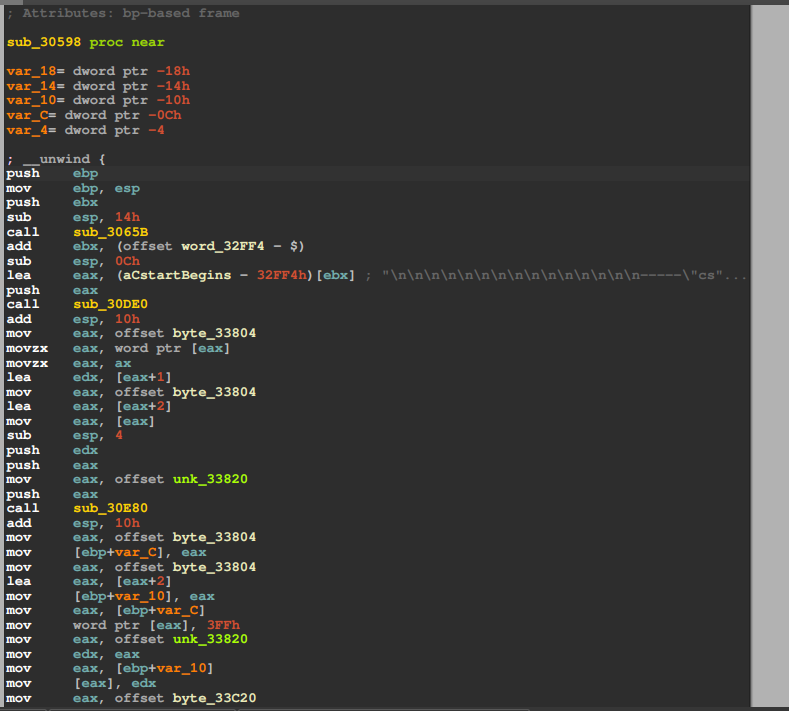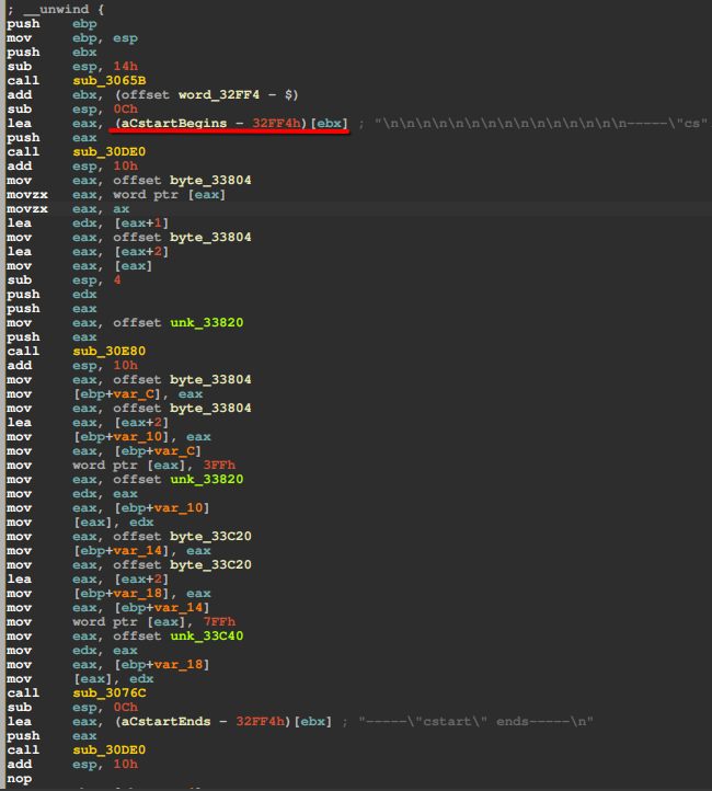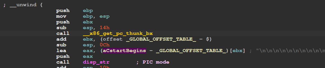发现在函数调用前竟然直接是将aCstartBegins的偏移赋值给了栈顶,根本没有前面分析的用ebx保存_GLOBAL_OFFSET_TABLE的地址的过程。也就是说这份程序编译时~~可能没有开启PIE ~~使用的重定位方法与笔者编译出的不同,是绝对寻址。