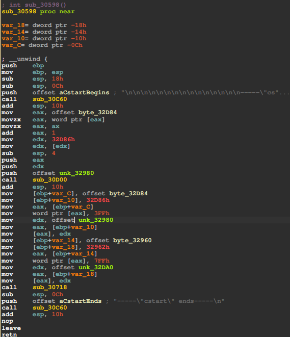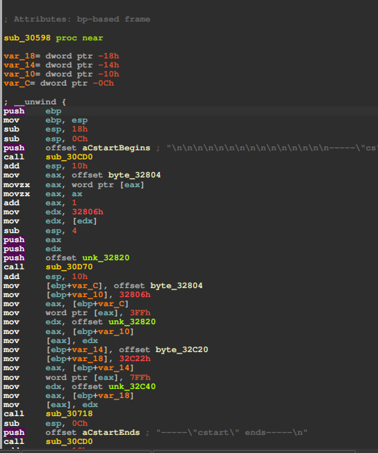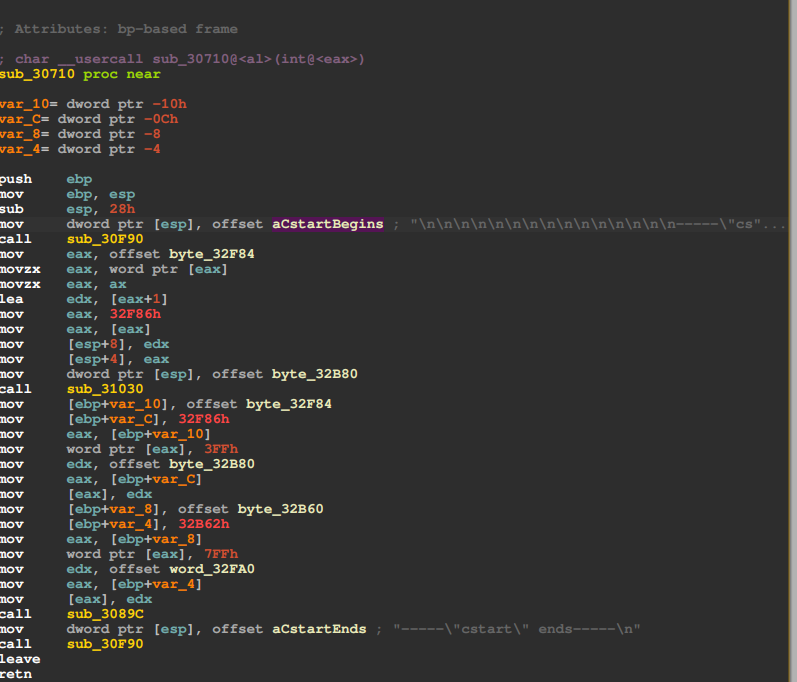 继续到第二次调用disp_str,用调试器或者静态分析都可以看到,正确的字符串aCstartEnds地址应该是aCstartBegins+0x2a=0x3102a。