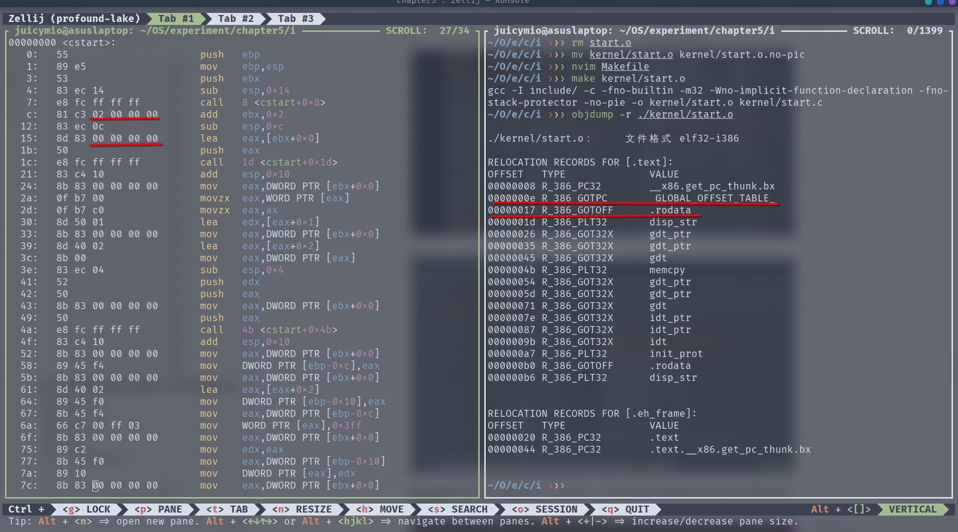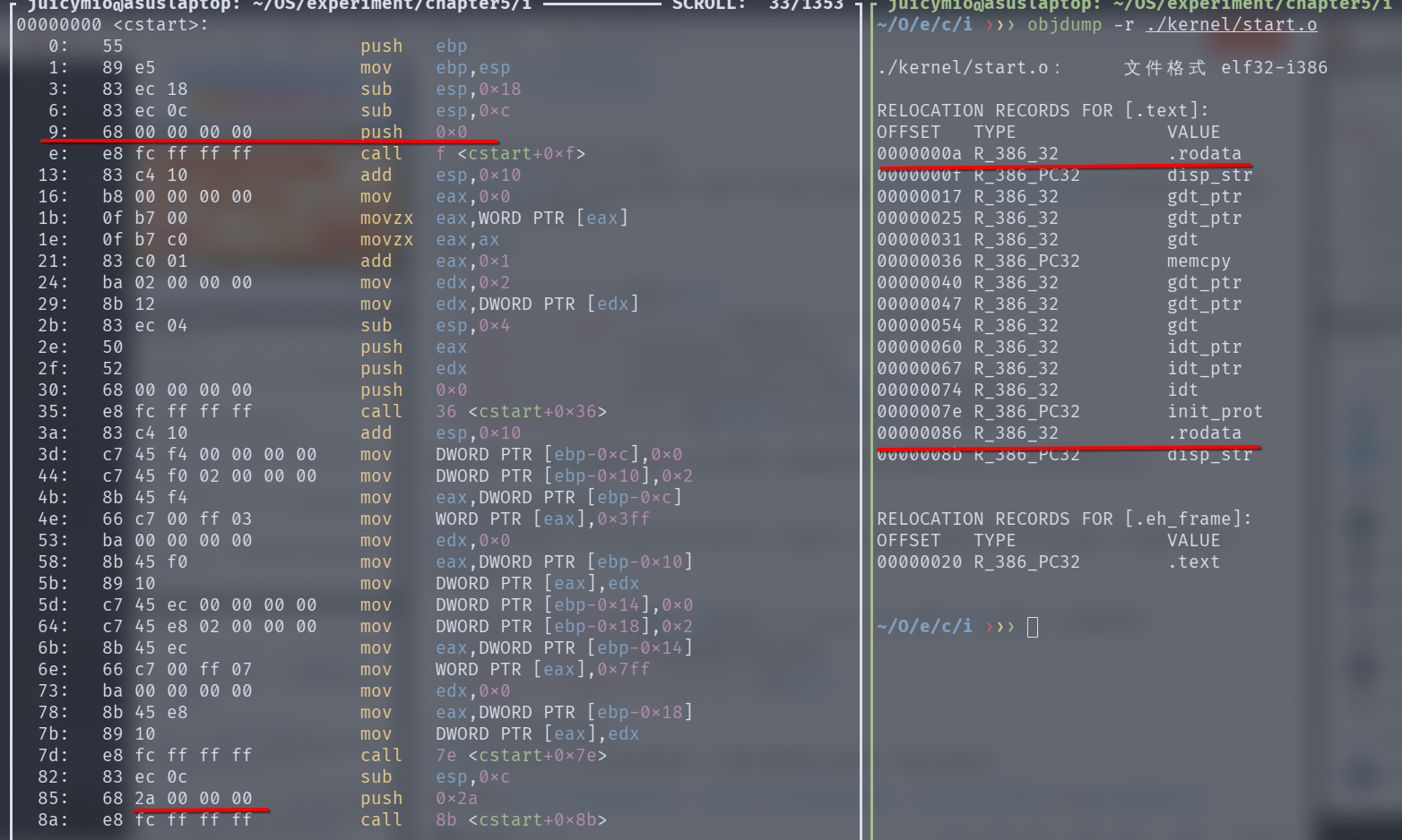 其中使用R_386_GOTPC的会因为该方式用到了ebx寄存器保存GOT地址,而该寄存器在disp_str中被修改,导致输出的字符串寻址错误,输出乱码。但使用R_386_32的由于寻址时没用到寄存器,不会表现出问题。