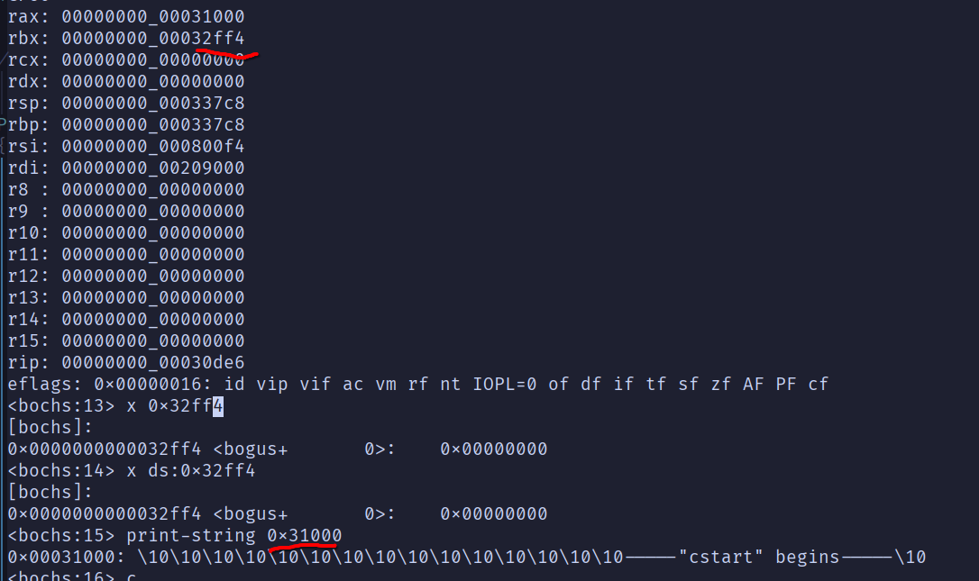 于是第一次调用十分正常,在disp_str中下断点,在bochs中调试: