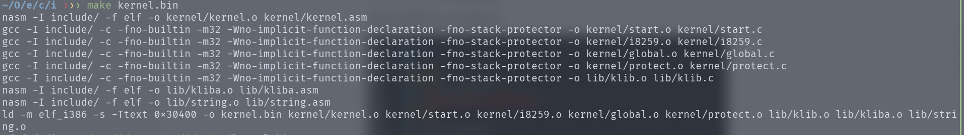 再进行验证:在Makefile中的CFLAGS里加入-no-pie。编译出的程序虽然跟附件中的有略微不同,但也是没有使用ebx运行时获取_GLOBAL_OFFSET_TABLE地址的过程。可以猜测就是由于PIE的开启,才导致了上述不同。也正是因为附件中的kernel.bin编译时没有开启PIE,所以不会有这个问题(事实上是disp_str违反调用约定却幸运地没被发现)。