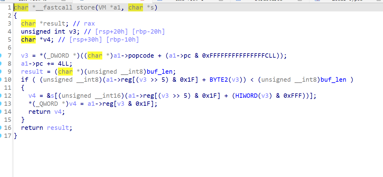 主要漏洞在于store和load指令检查时只检查reg+BYTE2(v3),计算时计算的是reg+HIWORD(v3)&0xFFF,所以可以越界读写虚拟机的缓冲区s。于是可以通过load栈上残留获取libc地址,再经过计算构造rop链,通过store越界写到栈上返回地址处。