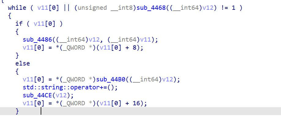 逆向+尝试后发现v13是一个c++ string,其内容是逐字符拼接而来,而字符的来源与qword_9040中存的堆块有关。