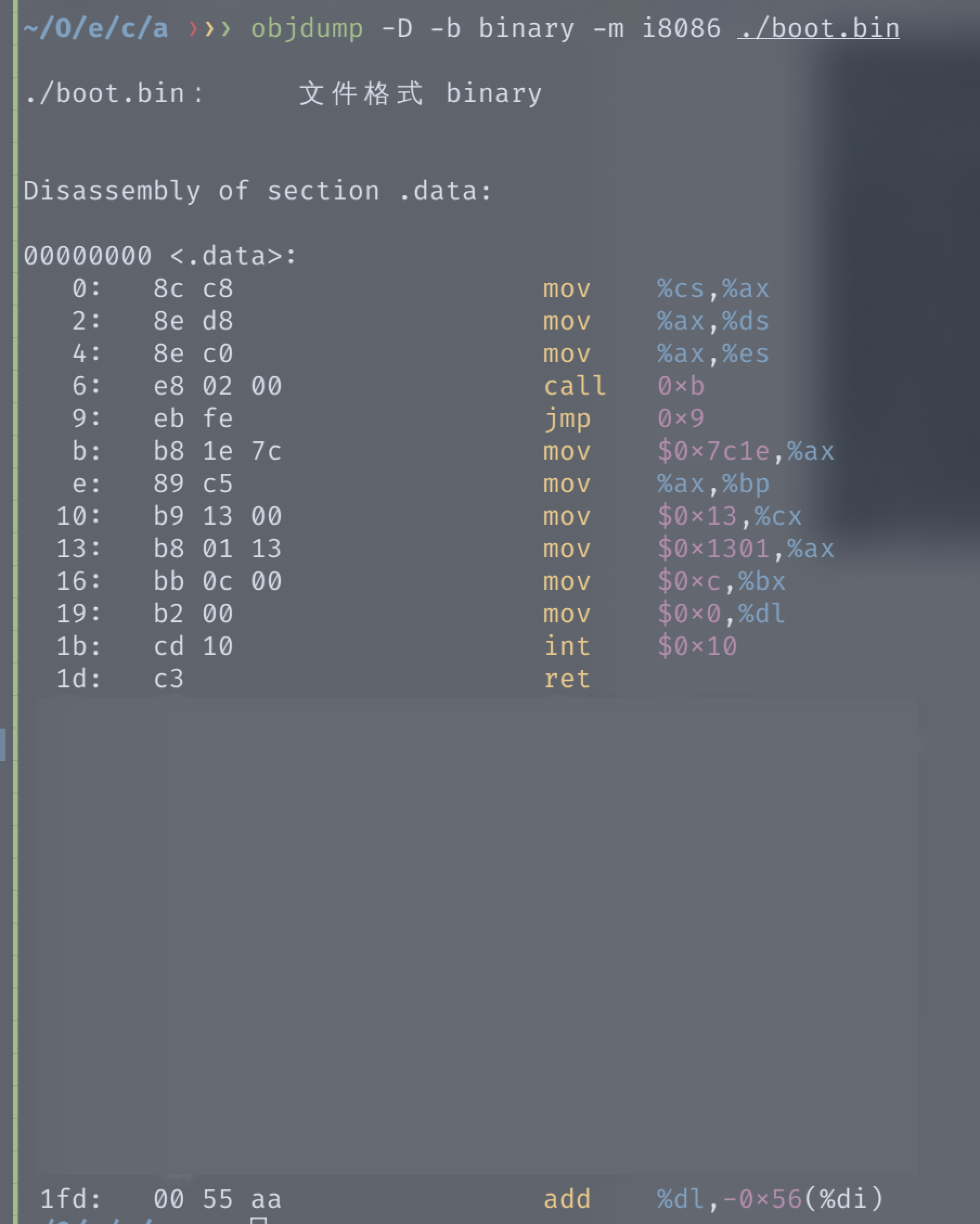 程序加载后,code段寄存器为0x7c00,而通过赋值段寄存器将data段和extra段寄存器为与cs相同,这样可以寻址到输出的字符串。